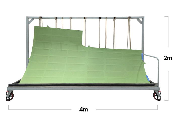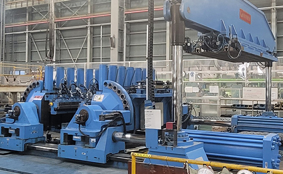 Applies tensile force to sheet or profile material to form complex curved surfaces against a die, producing fuselage skins and other curved structural components.